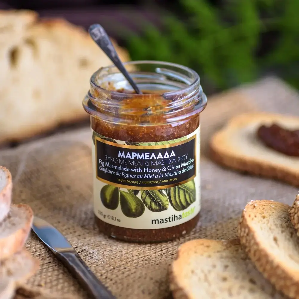 Vijgenconfituur met mastiha: excellent, compact, vol van smaak, gemaakt van gedroogde vijgen. Honing voegt een natuurlijke, discrete, zoete twist toe, terwijl mastiha een speciale smaak toevoegt en de smaak versterkt. Geen toegevoegde suikers. Inhoud 230gr